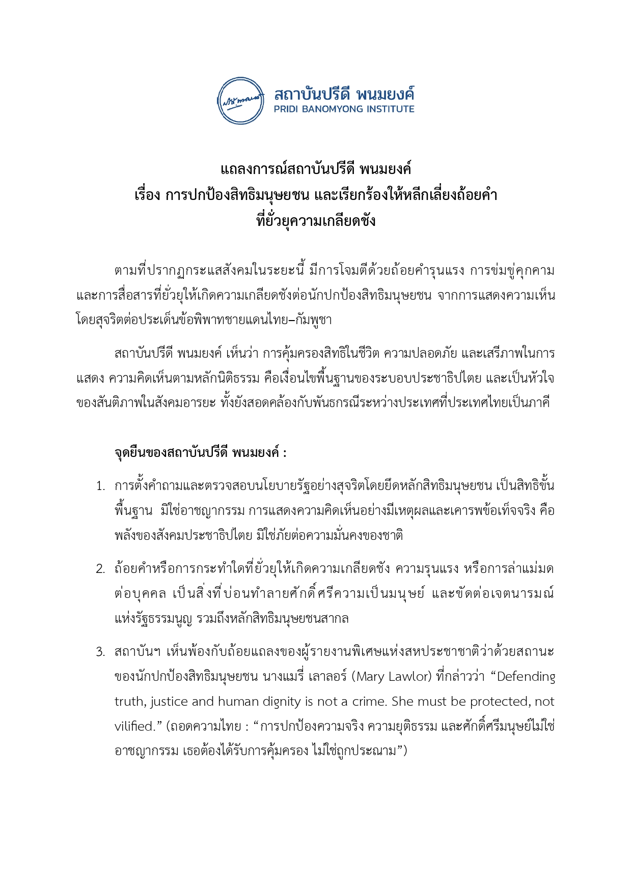 สถาบันปรีดี พนมยงค์ ขอเรียกร้องให้ทุกฝ่ายหลีกเลี่ยงถ้อยคำและการกระทำที่ยั่วยุความเกลียดชัง และขอให้หน่วยงานของรัฐดำเนินการคุ้มครองความปลอดภัยของนักปกป้องสิทธิมนุษยชนผู้แสดงความเห็นโดยสุจริตบนหลักแห่งกฎหมายและศีลธรรม