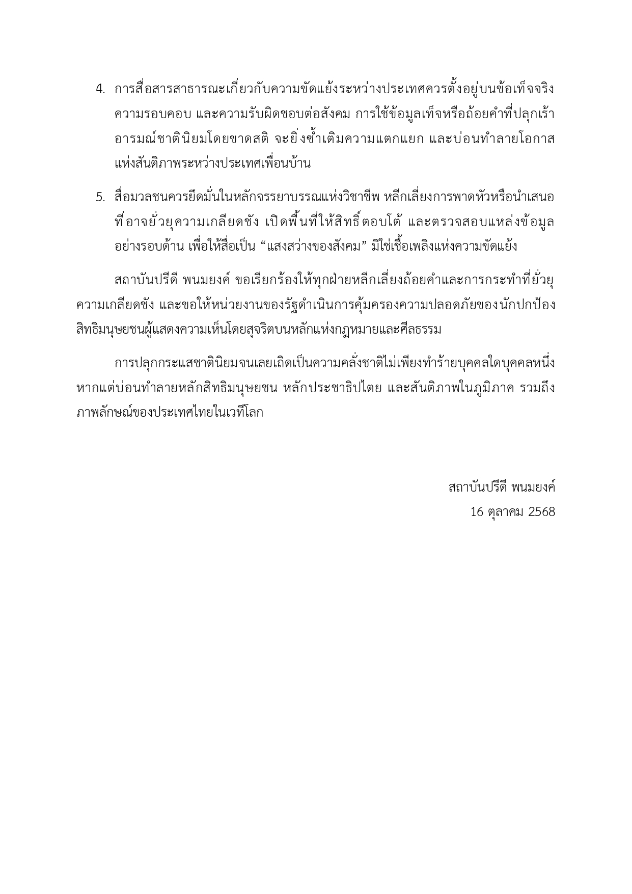 - การสื่อสารสาธารณะเกี่ยวกับความขัดแย้งระหว่างประเทศควรตั้งอยู่บนข้อเท็จจริง ความรอบคอบ และความรับผิดชอบต่อสังคม การใช้ข้อมูลเท็จหรือถ้อยคำที่ปลุกเร้าอารมณ์ชาตินิยมโดยขาดสติ จะยิ่งซ้ำเติมความแตกแยก และบ่อนทำลายโอกาสแห่งสันติภาพระหว่างประเทศเพื่อนบ้าน