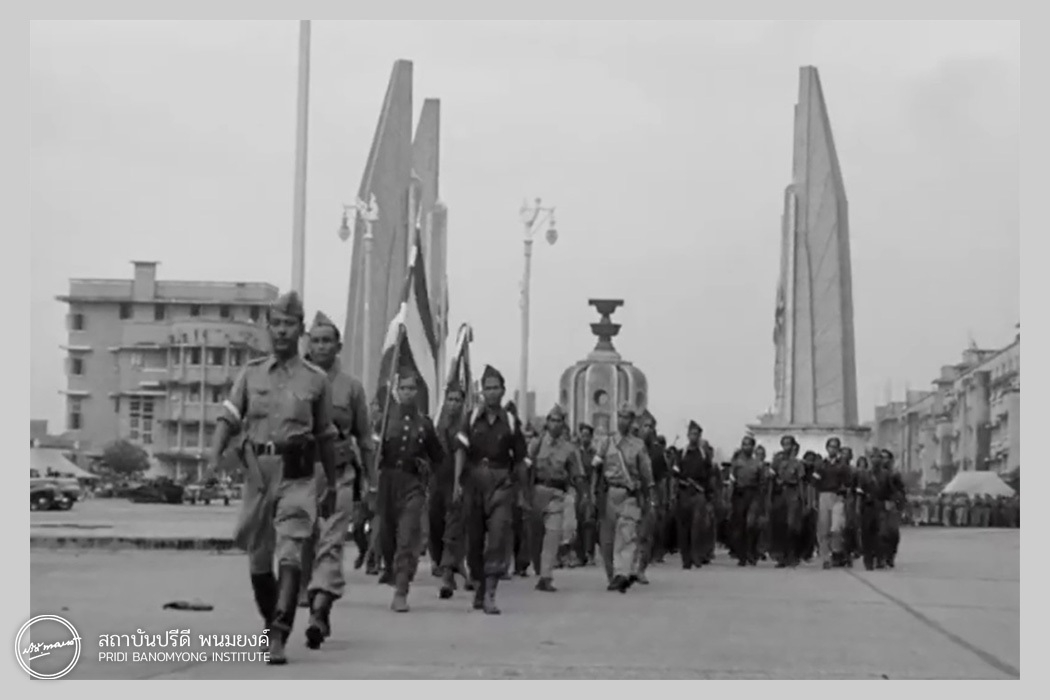 ภาพการสวนสนามของพลพรรคเสรีไทยบนถนนราชดำเนิน วันที่ 25 กันยายน พ.ศ. 2488
