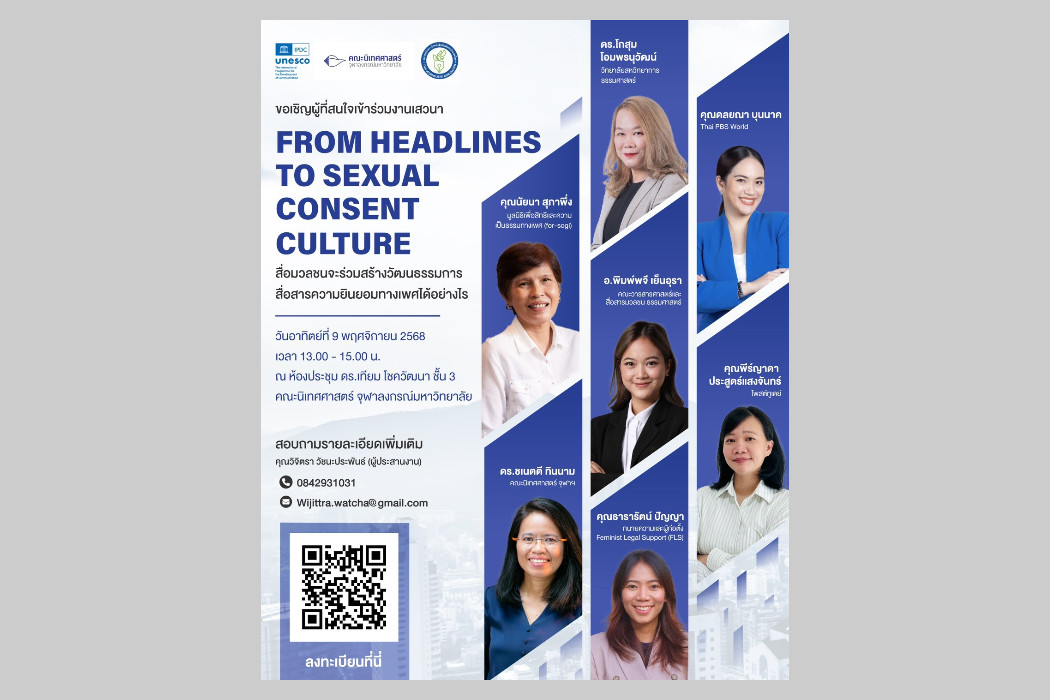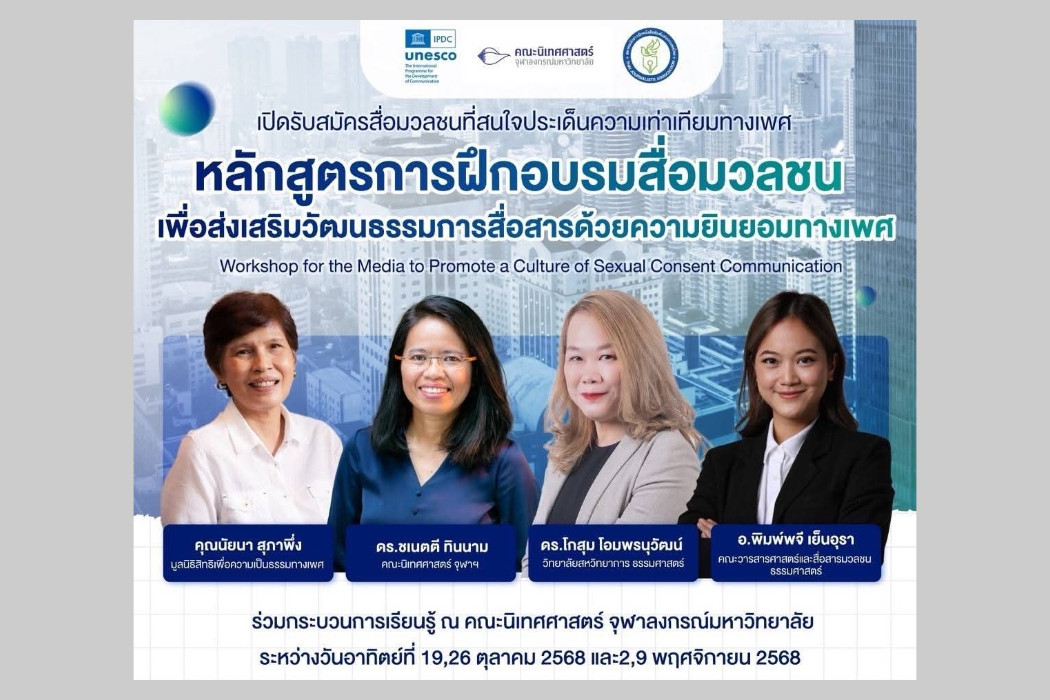 ปิดหลักสูตรการอบรม 4 วัน ด้วยวงเสวนา “ From Headlines to Sexual Consent Culture : สื่อมวลชนจะร่วมสร้างวัฒนธรรมการสื่อสารความยินยอมทางเพศได้อย่างไร ” [3] วันอาทิตย์ที่ 9 พฤศจิกายน 2568 เวลา 13:00-15:00 น. ณ ห้องประชุม ดร.เทียม โชควัฒนา ชั้น 3 คณะนิเทศศาสตร์ จุฬาลงกรณ์มหาวิทยาลัยการเสวนาจัดขึ้นเพื่อเป็นแนวทางร่วมสร้างวัฒนธรรมการสื่อสารความยินยอมทางเพศ แลกเปลี่ยนเรียนรู้ประเด็นการสื่อสารด้วยความยินยอมทางเพศ สิทธิมนุษยชน และความเท่าเทียมทางเพศ ภายใต้ความร่วมมือของ UNESCO และ สมาคมนักข่าวนักหนังสือพิมพ์แห่งประเทศไทย