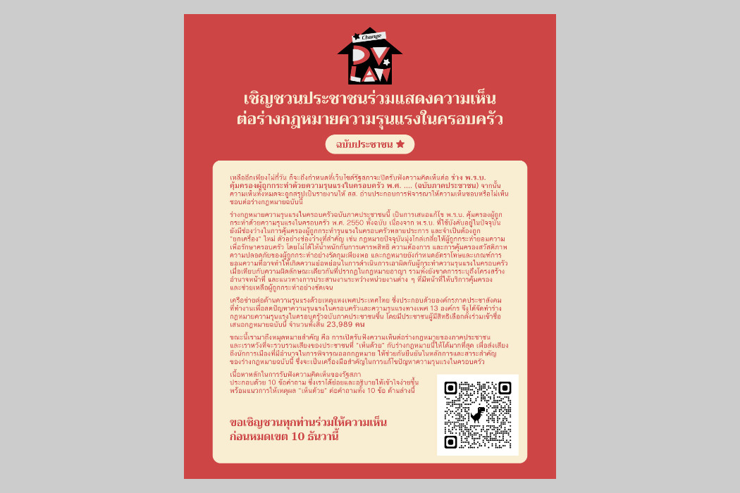ร่วมกันผลักดัน ‘ กฎหมายใหม่ ’ ที่ยึด ‘ ผู้เสียหายเป็นศูนย์กลาง ’ และให้การคุ้มครองแบบครอบคลุม ขอเชิญแสดงความเห็นต่อ “ ร่าง พ.ร.บ. คุ้มครองผู้ถูกกระทำด้วยความรุนแรงในครอบครัว[11] พ.ศ. ....(ฉบับภาคประชาชน) ” เพื่อผลักดันให้ร่างกฎหมายของภาคประชาชนฉบับนี้เป็น #บ้านพื้นที่ปลอดภัยของทุกคน และร่วมให้ความเห็น “ เห็นด้วย ” เพื่อผลักดันโดยสแกน QR code ในภาพ