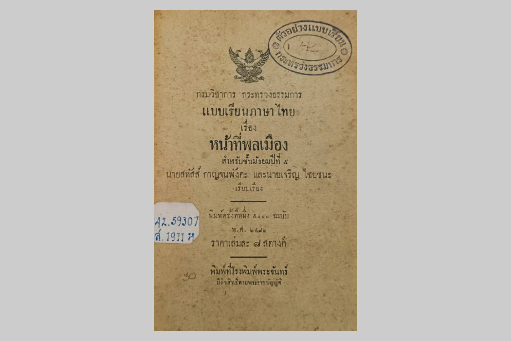 - สหัสส์ กาญจนพังคะ และ เจริญ ไชยชนะ. แบบเรียนภาษาไทยเรื่อง หน้าที่พลเมือง สำหรับชั้นมัธยมปีที่ ๕. พระนคร : โรงพิมพ์พระจันทร์, 2482.