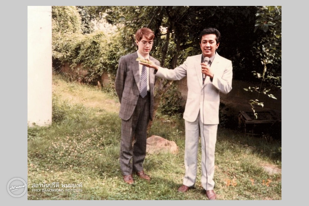 ส่วนคุณยาย (ท่านผู้หญิงพูนศุข) ขนาดตอนที่ผมแต่งงานคุณยายก็เป็นเถ้าแก่ให้ผมนะครับเลยสนิท ได้ถ่ายรูปกับท่านเยอะมาก ท่านน่ารักมาก ทั้ง ๆ ที่ท่านเองก็มีหลานฝรั่ง แต่เคยแนะนำผมให้คนรู้จักเวลาไปหาที่บ้านบอกว่า “หลานฝรั่งของฉัน” ซึ่งรู้สึกเป็นเกียรติอย่างยิ่งที่ท่านเรียกอย่างนี้ แต่ถ้าพูดถึงอาจารย์ปรีดี ผมคิดว่าผมได้คุยกับท่านโดยตรงจริง ๆ แค่ไม่เกิน 2-3 ครั้ง เพราะว่าผมยังเป็นเด็ก อาจจะเกรงใจ ตอนเป็นเด็กค่อยข้างเขินไม่ได้คุยเก่งเหมือนสมัยนี้